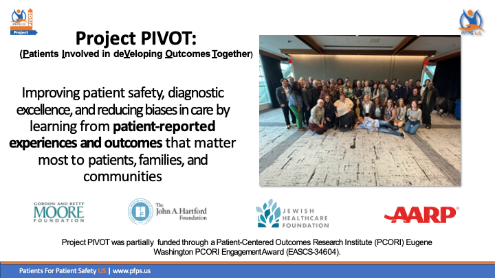 Project PIVOT is a novel, patient-led initiative to advance the integration of patient-identified and prioritized patient-reported outcomes (PROs) and patient-reported experiences (PREs) that address patient safety, diagnostic accuracy, and timeliness, and discrimination/bias into Patient-Centered Comparative Clinical Effectiveness Research (CER) and national and organizational quality assessment survey tools (e.g., HCAHPS, PREMs, and PROMs). The leadership team includes Sue Sheridan, President and CEO, Martin Hatlie, Director of Advocacy and Policy, Armando Nahum, Chief Operating Officer, and PFPS US Champions, Suz Schrandt and Vonda Vaden Bates.